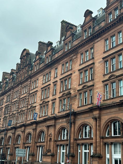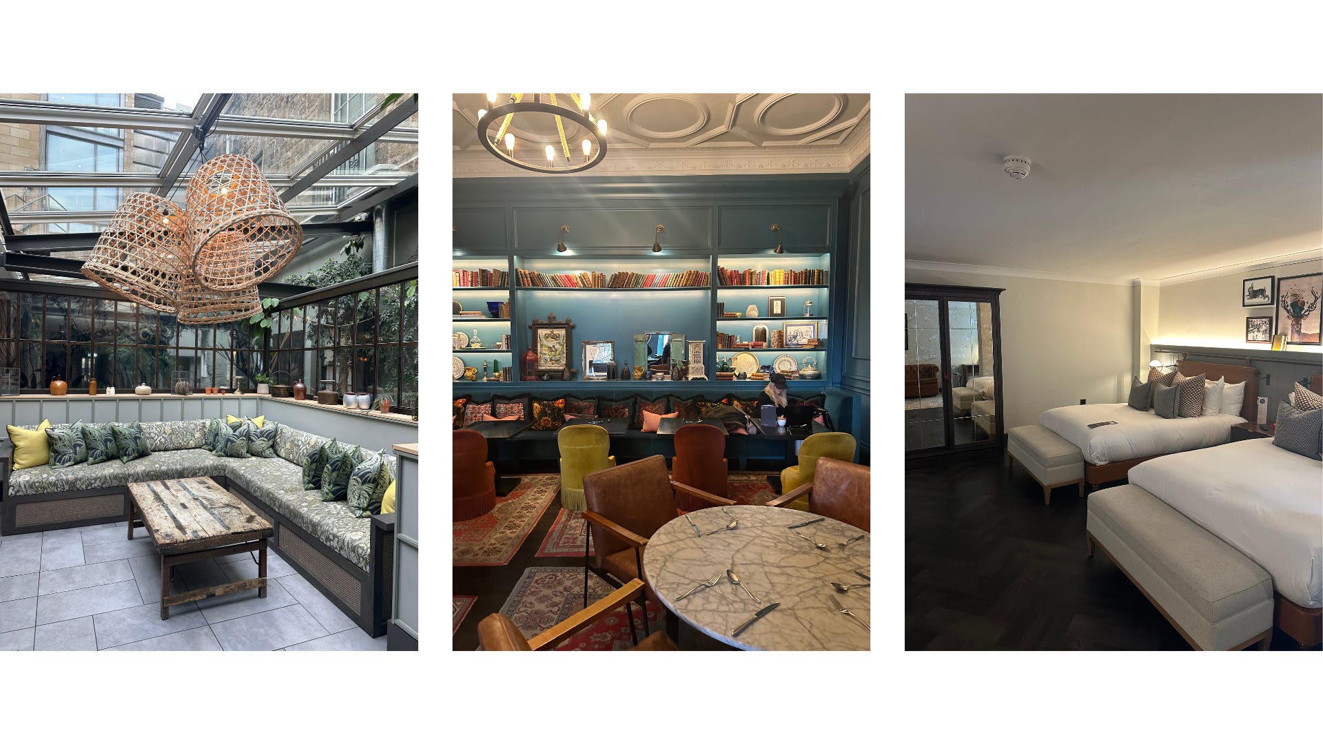I stayed at The Kimpton Charlotte Square Hotel. Located steps from Princes Street and George Street, it’s an ideal home base for exploring both Old and New Town. The glasshouse courtyard was perfect for a morning coffee or a little nightcap, and there were countless cozy spaces to work. The breakfast dining rooms and food spreads are next level and there was also a really good mezze style place (BABA) in the hotel. The gym and spa were also very high end, and there was nothing better than ending a full day of walking around with a pre-dinner sauna/steam room sesh.