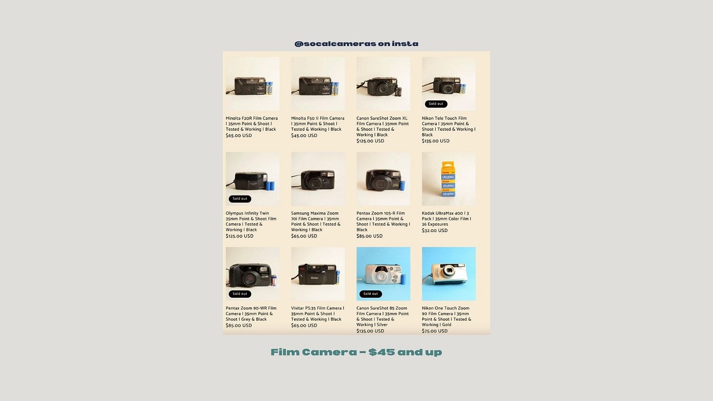 Film Camera: Socal cameras has the best selection of tested and used film cameras. This + a few rolls of film is perfect for someone about to travel and feels a bit more elevated that your general disposable camera.