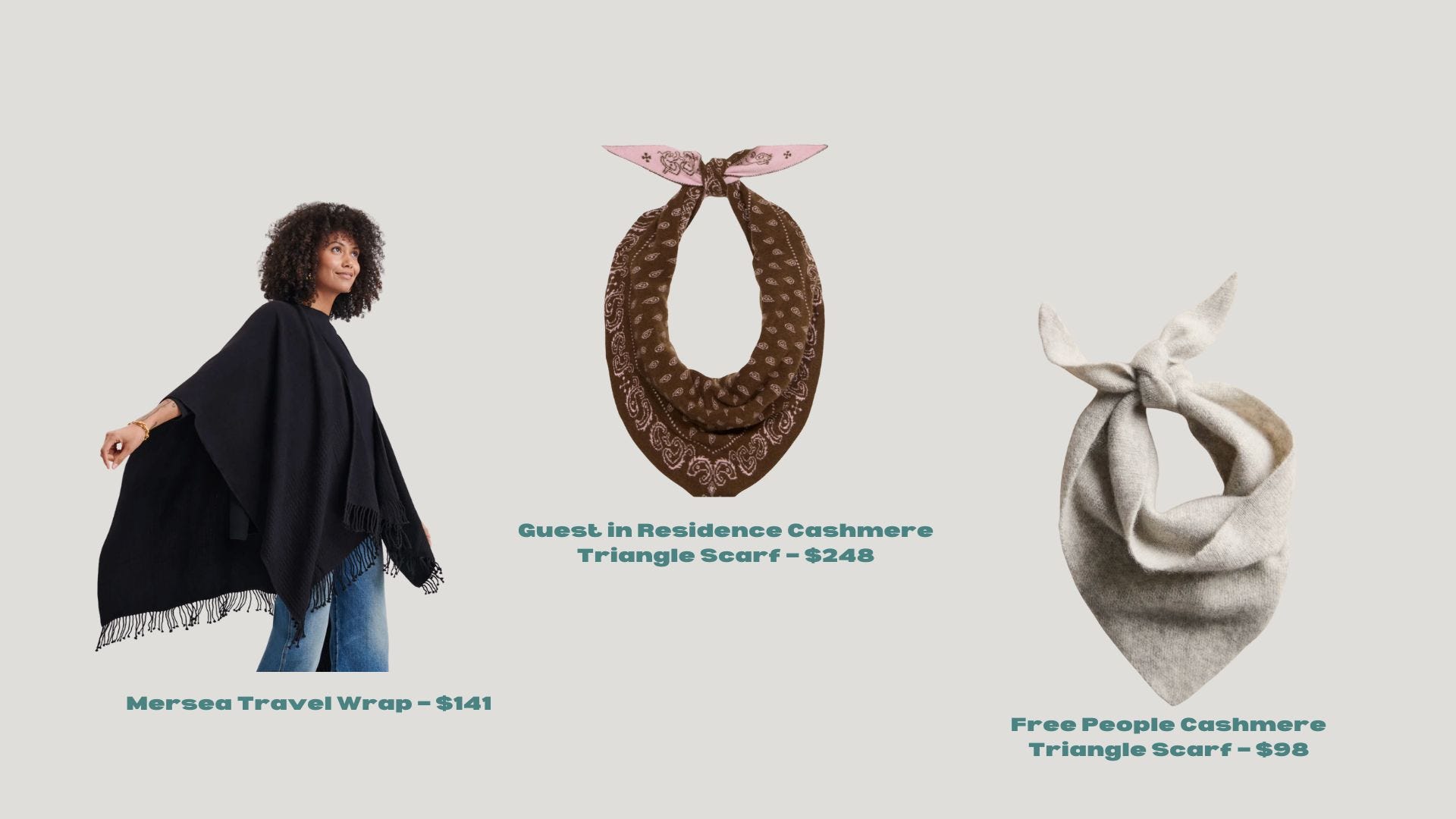 Travel Wrap: Much easier than bringing a blanket on your flight AND you can wear it when you reach your destination. My mom loves these Mersea ones. I’ve also been seeing triangle scarfs EVERYWHERE (like this Guest in Residence one that is currently sold out and this one from Free People) and think they make such a cute layer over a jacket and would pack super easily.