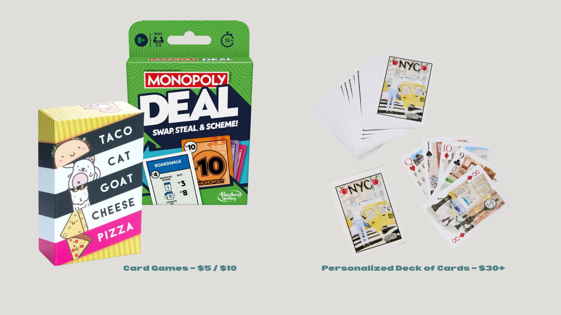 Card Games: I now never travel without a deck of cards and a game of sorts. A deck of cards is a really easy souvenir to bring home if you have recently traveled, or there are plenty of destination themed options on the market. In terms of games, Monopoly Deal is the current friends group favorite, as is this one.
