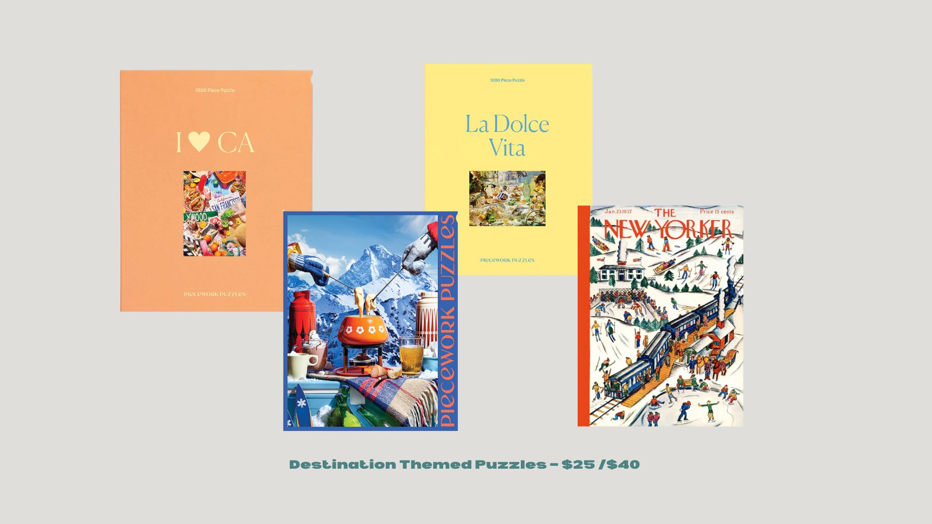 Destination Puzzles: I love this brand (sold on Revolve) and they look cute on a shelf. This one from Tuckernuck is also fun and festive.